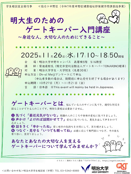 - 生田 オンライン 生田キャンパス 中央校舎6階メディアホール(0608教室)、オンラインはZoomを使用