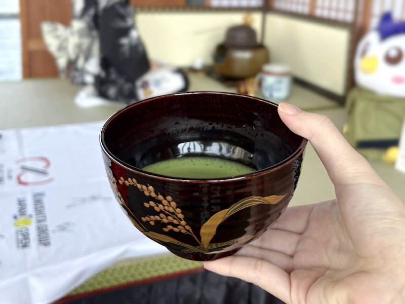 イベント参加前は、越前漆器については名前を聞いたことがあるという程度でした。また、漆器と聞いて、シンプルで真っ黒なものをイメージしていました。しかし、実際には稲穂や紅葉の柄が描かれているものや、黄色やオレンジなどのカラフルなものがあり、かわいらしさもありつつ、とてもきれいで驚きました。また、実際に抹茶碗として使ってみると、その軽さと艶のある上品な質感に魅力を感じました。