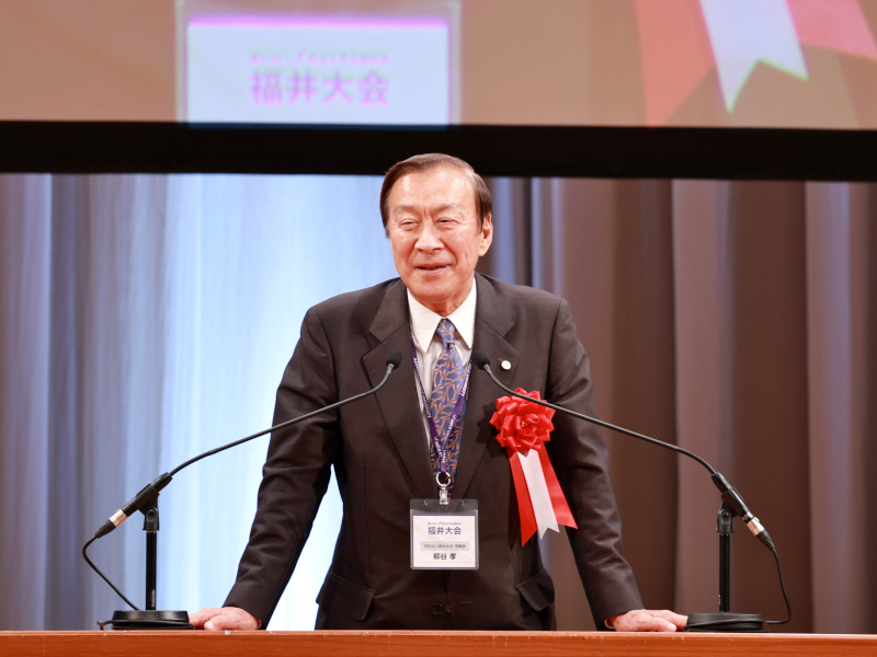 上野学長その後、来賓の杉本達治福井県知事、西行茂福井市長、佐々木勝久鯖江市長、山本早苗連合父母会長から祝辞があり、北野会長と柳谷理事長による万歳三唱、冨田行雄福井県支部副支部長のあいさつで閉会となった。
