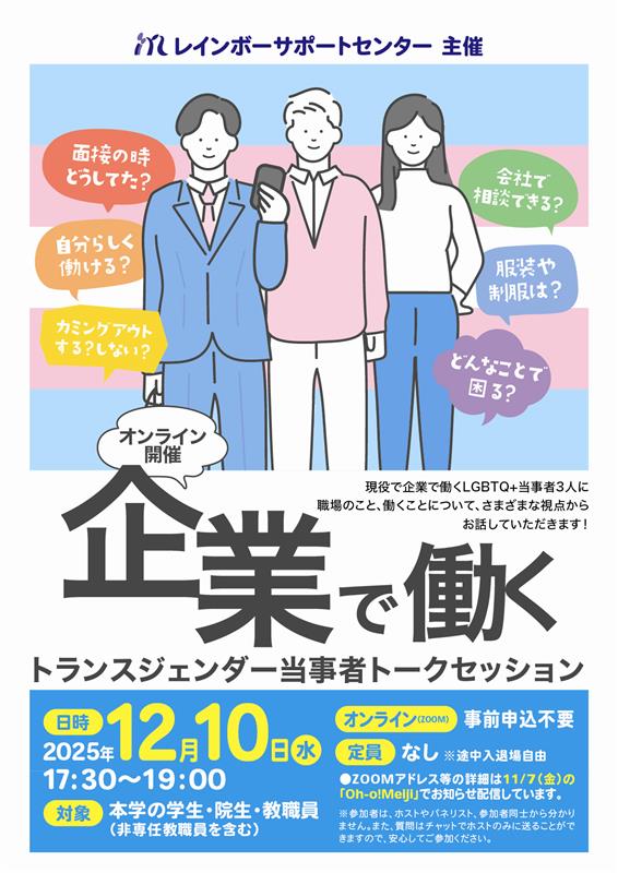 | 時間補足 | 17:30~19:00 ※Zoomアドレス等の詳細は、11/7(金)配信の「Oh-o! Meijiお知らせ」をご確認ください |