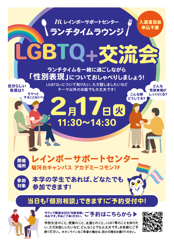 明治大学レインボーサポートセンターは、2月17日(火)に駿河台キャンパスで「LGBTQ+交流会〜性別表現についておしゃべりしましょう!〜」(ランチタイム対面ラウンジ)を開室します!
