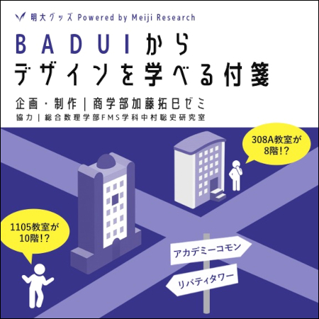その取り組みの第一弾として、総合数理学部・先端メディアサイエンス学科の中村聡史研究室と協力し、「BADUIからデザインを学べる付箋」を開発した。BADUI(バッドユーアイ)とは、実際に使いにくい・分かりにくいユーザインタフェースを意味する概念。今回開発した付箋は、BADUIを題材に、大学の研究成果をユーザーに分かりやすく伝えるものとなっている。