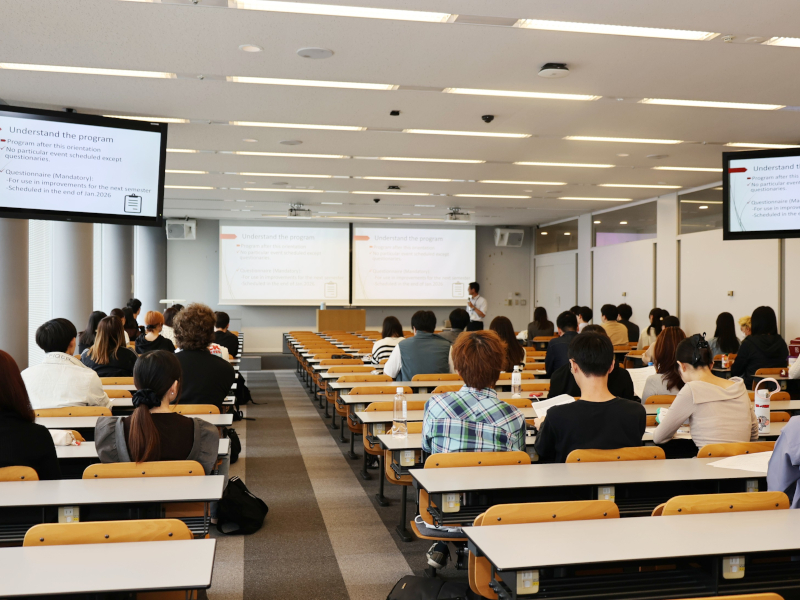 駿河台キャンパスでのオリエンテーションでは、事前にマッチングしたパートナーと初の顔合わせの場となり、約60人の学生が参加した。冒頭、自己紹介を兼ねたアイスブレーキングが行われ、緊張していた学生たちの表情から次第に笑顔が見られた。その後、事務局からプログラムの説明や言語交換のヒントの紹介があり、参加学生らは興味深く聞き入った。