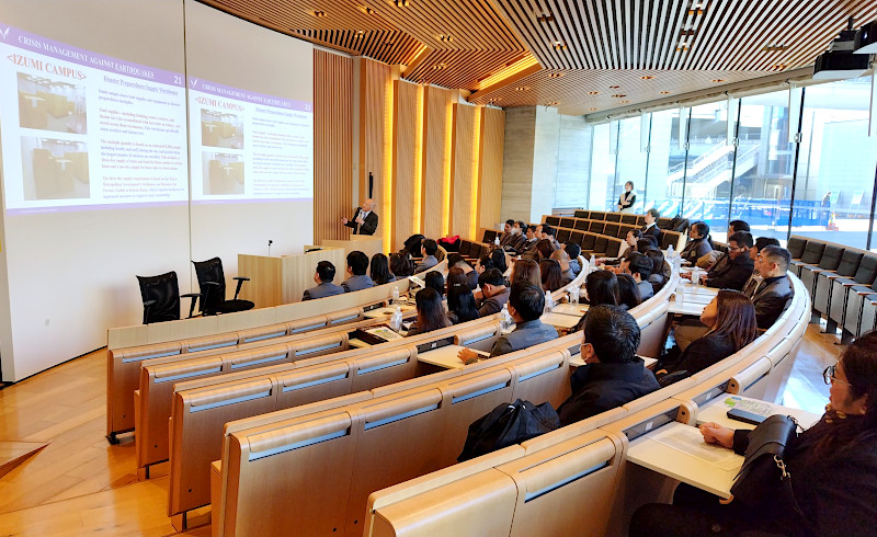 (前列左から)Soonsinpai社会科学部長、Moolsilpa副学長、上野学長、小野島政治経済学部長本学の協定校であるタイ・シーナカリンウィロート大学社会科学部の教職員43人が、2025年12月11日・12日、駿河台キャンパスと和泉キャンパスを訪れた。今回の訪問は、同年8月に本学政治経済学部の小野島真学部長らが同大学を訪れた際、同大学から本学の危機管理体制や環境問題への取り組みについて研修の機会を得たいとの打診があり、実現したもの。