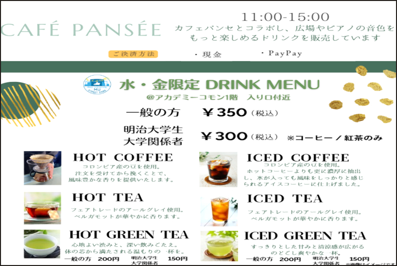 都心型キャンパスである駿河台キャンパスに「滞在するだけで楽しめ、歩けばウキウキする広場を作ろう!」ということを目的とし、オープンスペースへのピアノの設置に加え、明治大学アカデミーコモンの1階にあるダイニングカフェ「カフェパンセ」の協力のもと、明大生がハンドドリップで抽出したコーヒーの販売を行います。また、ベンチや人工芝などを設置し、多くの人が滞在できるような環境づくりを行っています。