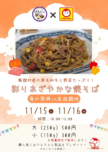 東洋水産株式会社とコラボし、学生考案のオリジナル焼そばを販売します。この焼そばは、東日本大震災からの復興に取り組む福島県飯舘村の農畜産物を使用しています。「黒毛和牛」「いいたて雪っ娘かぼちゃ」「パプリカ」を使用した「彩りあざやかな焼そば」となっています。