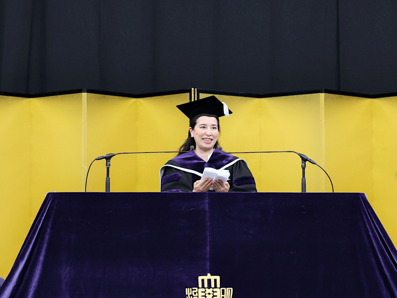 告辞で上野学長は、明治大学の建学の精神「権利自由、独立自治」に触れ「大学生活は、新しい知に出会う時間であると同時に、新しい人と出会い、まだ見ぬ自分、新しい自分と出会う時間でもある。対話を重ね、思索を深める中で、自らの言葉で世界を語り、未来を変えていく存在へと成長していってほしい」と新入生へ語りかけた。[学長告辞 全文]