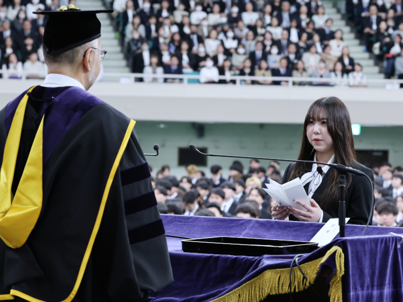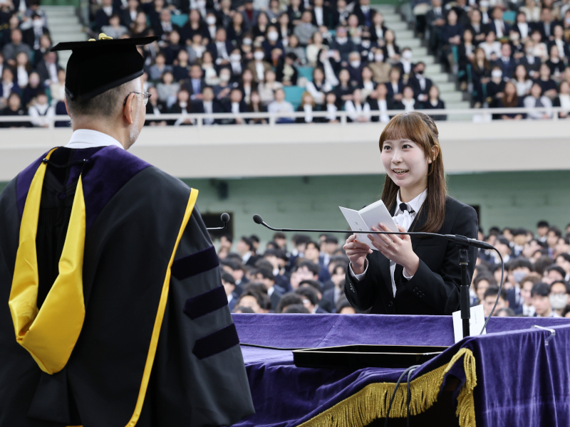 祝辞を述べる山本連合父母会長新入生代表による宣誓は、午前の部に商学部の藤原泉美さん、午後の部に国際日本学部の假谷麻心さんが登壇。藤原さんは「学問に真摯に向き合い、どのような困難に直面しても決して諦めることなく、挑戦し続ける強い意志を持ち続けたい」、假谷さんは「多様な文化や考え方に触れながら、日本の持つ魅力と課題の双方を見据え、それらを自らの言葉で発信する力を身に付けていきたい」と新たな決意を述べた。