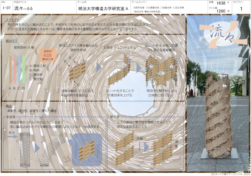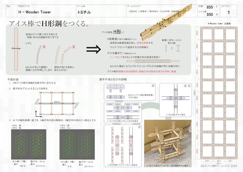 モテモテ賞「流々――るる」エレガント賞を受賞したのは建築構造研究室の武田丈さん・原碧波さん(いずれも理工学研究科博士前期課程2年生)・野末琉生さん(理工学研究科博士前期課程1年生)・山口昂希さん(理工学部4年生)・伊東佳純さん(理工学研究科博士前期課程2年生)が制作した「H-Wooden Tower」。アイス棒でH形鋼を再現することで、ねじれの大幅な抑制と高い耐震性能を実現し、塔状比の高い純ラーメン構造のタワーを作り上げた。