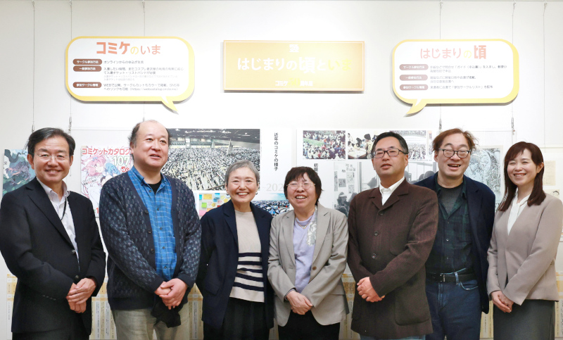 (左から)歌代館長、筆谷氏、米澤氏、安田氏、市川氏、里見直紀氏(コミケ準備会)、みさき氏米沢嘉博記念図書館・現代マンガ図書館は2月27日、同館の企画展「コミケ50周年―コミケにまつわる50のアイテム―」のオープニングイベントとして、同展を監修したコミックマーケット準備会メンバーら関係者を招き、内覧会を開催した。